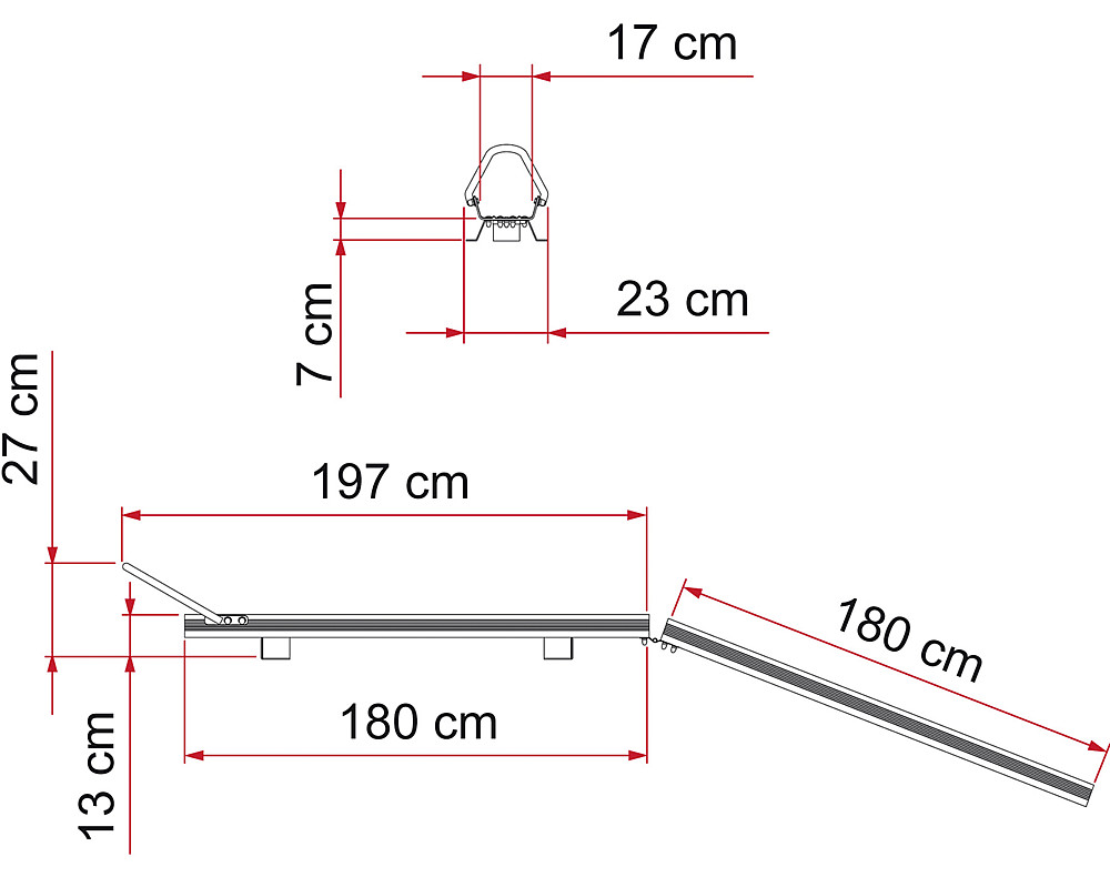 Pour une installation permanente dans le garage arrière. Se compose d’un solide rail de support en aluminium (180 x 14 cm) et d’un rail de conduite (180 cm), qui sont reliés les uns aux autres lors du chargement. Le scooter / moto peut être fixé de manière optimale pendant la conduite grâce au support de retenue mobile et aux 2 sangles solides.