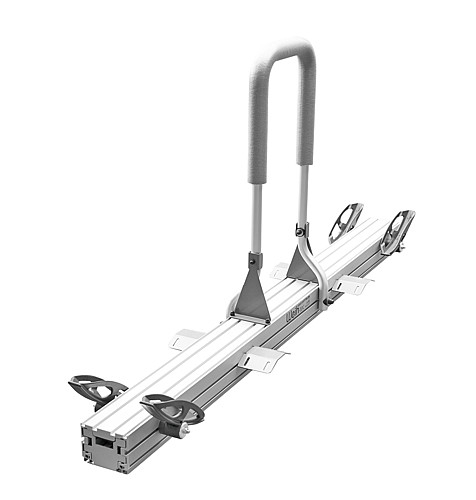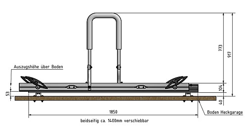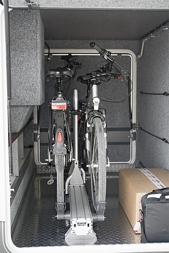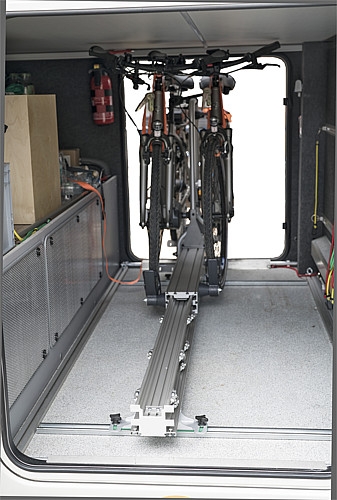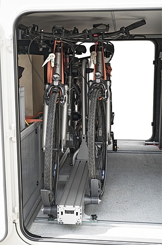 Système de support qui peut être retiré des deux côtés pour 2 vélos. Idéal pour les mobiles à 2 portes. Le support est vissé au plancher du véhicule avec des profilés coulissants transversaux. Grâce à la conception peu encombrante, le garage arrière sur le côté du porte-bagages peut toujours être utilisé comme espace de rangement. Distance du vélo environ 20 cm.