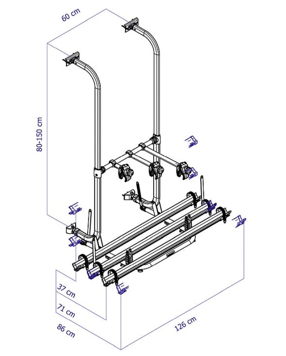 Pour la paroi arrière verticale des camping-cars / caravanes, convient pour Carado, Sunlight. Dethleffs. Rails réglables de gauche à droite. Les sangles de jante verrouillent les vélos pendant le transport et les supports de cadre de vélo coulissants maintiennent les vélos en place. La plate-forme est verrouillée manuellement et peut facilement être verrouillée dans le mouvement ascendant lorsqu’elle n’est pas utilisée.