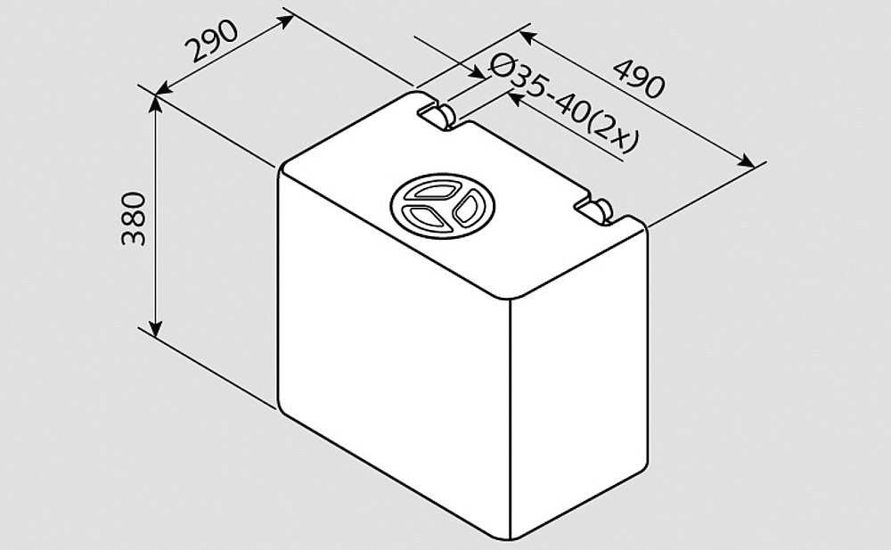 Réservoir d’eau avec ouverture de nettoyage ø 12 cm et 2 buses de remplissage ø 4 cm, qui sont intégrées dans le réservoir (pas de saillies). Prise fermée à la livraison, à ouvrir si nécessaire.
