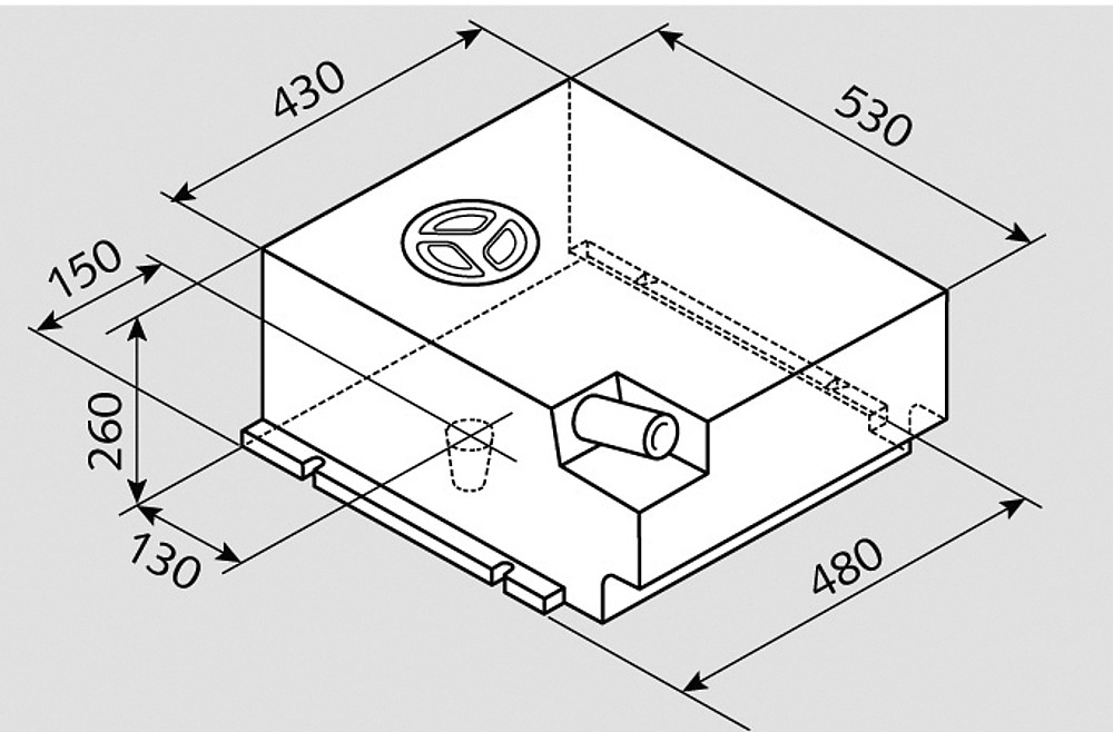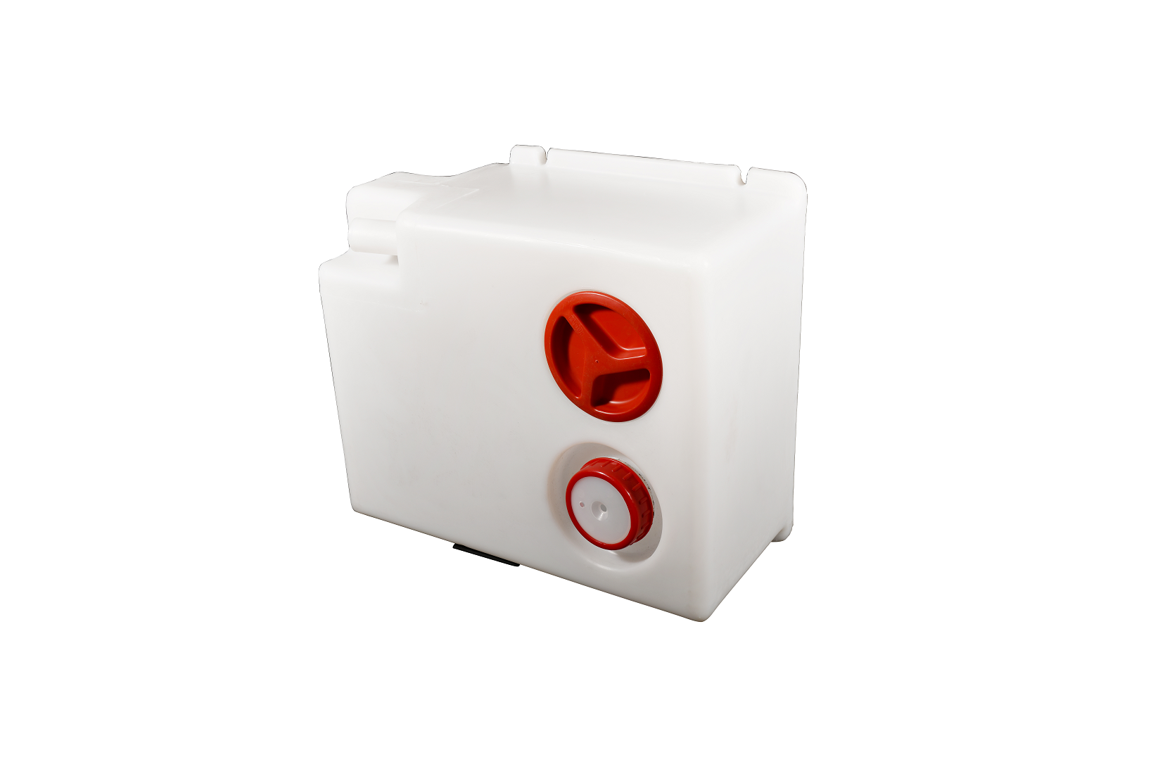 Réservoir pour installation permanente dans le banc. Avec ouverture de nettoyage ø 12 cm et 1 buse d’entrée ø 4 cm. Dessous avec buse de vidange pour traverser le plancher du véhicule, fermé par des bouchons filetés ½ ?à l’intérieur du réservoir. Fixation à 4 emplacements intégrés.